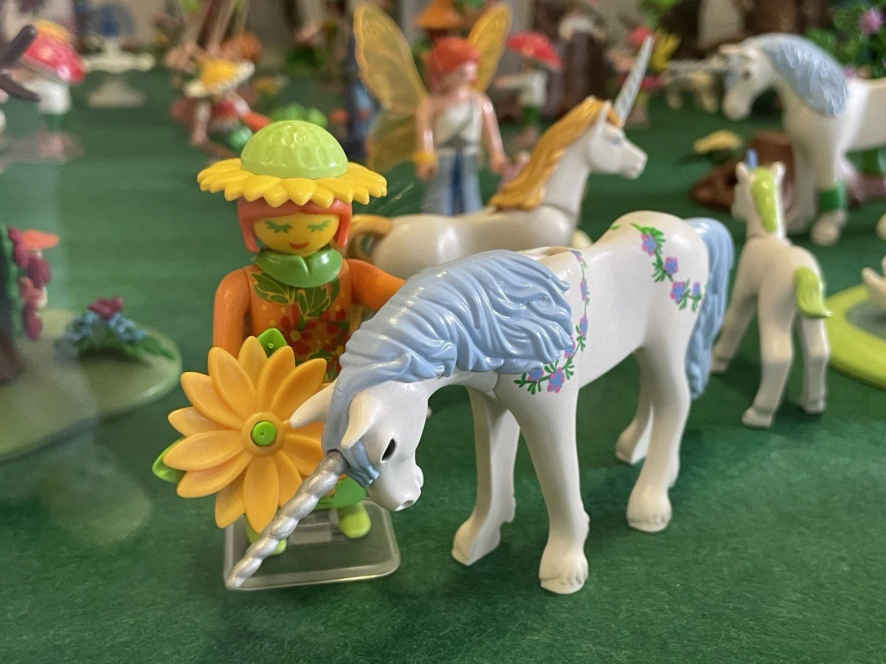 Una manada de míticos unicornios, admirados y cuidados con esmero por un niño-hada y el hada de las flores… Es un momento de ternura que resalta la conexión entre las criaturas mágicas y sus protectores.
