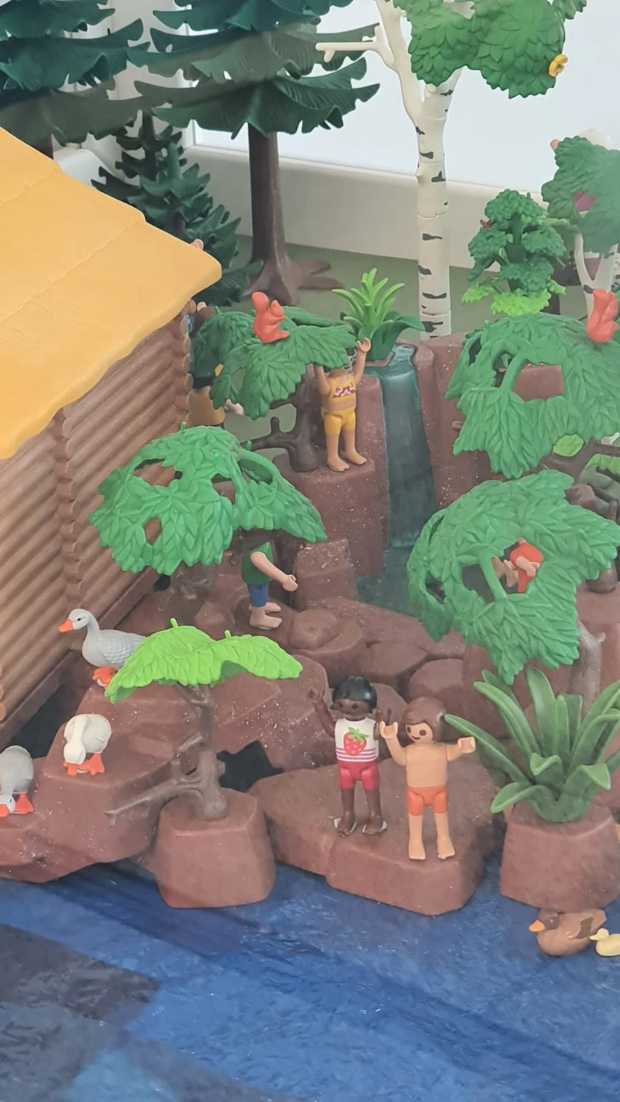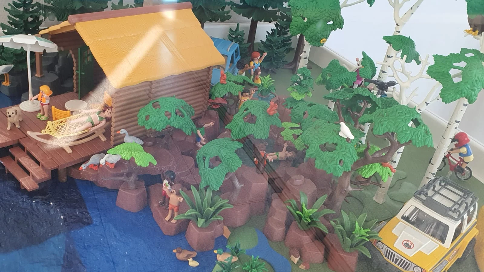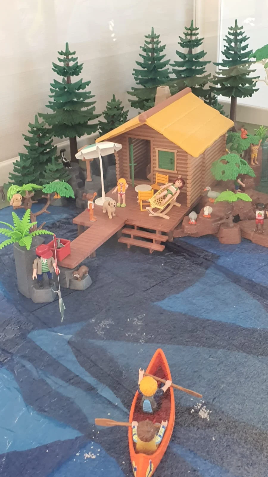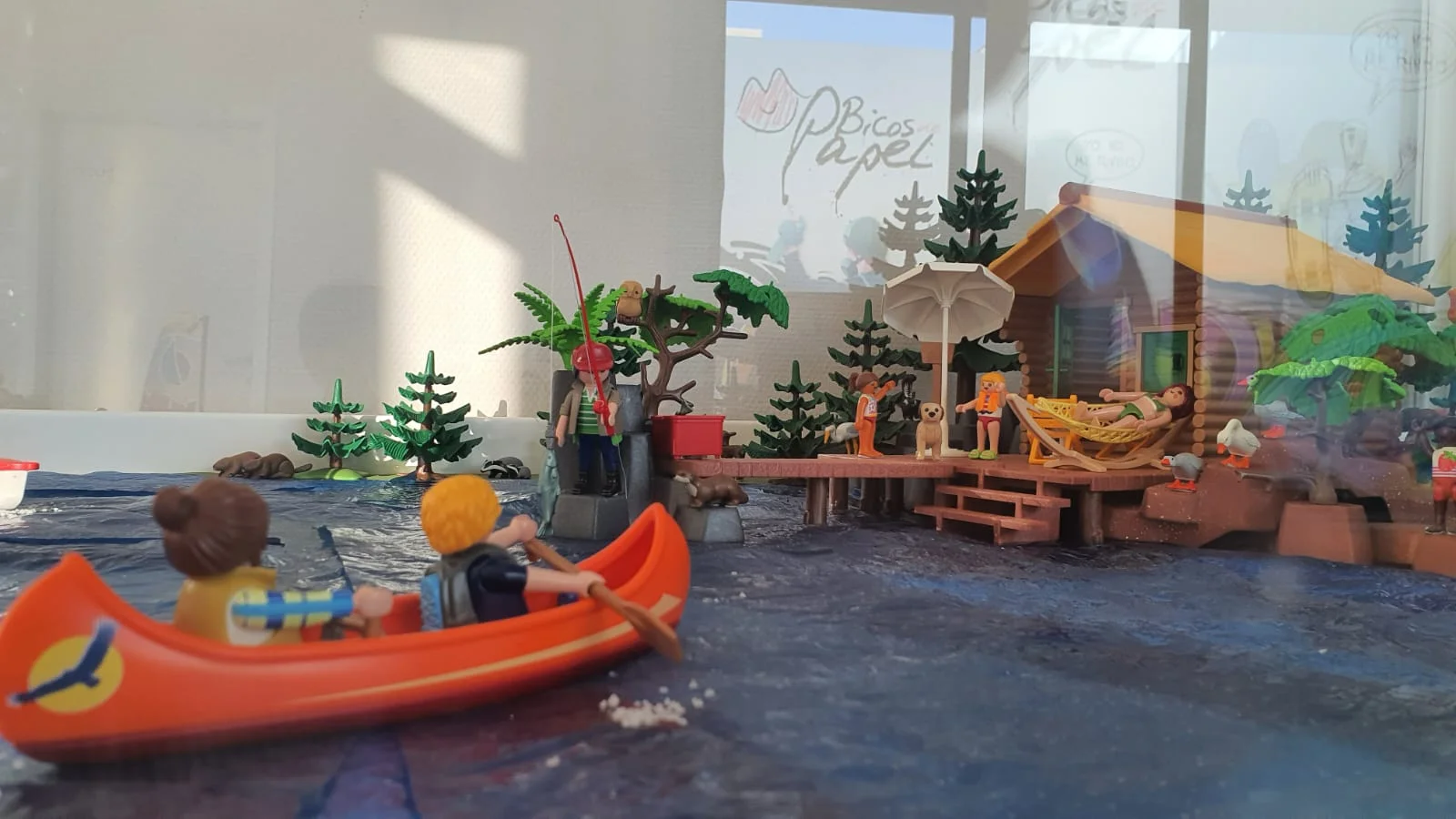 A orillas de un tranquilo lago, la cabaña de madera sirve de punto de encuentro para un día perfecto al aire libre. Frente a ella, varias figuras disfrutan del sol, recostadas en tumbonas, conversando. Entre pinos y abedules se escucha el murmullo de una pequeña cascada, donde unos niños juegan felices chapoteando en el agua.