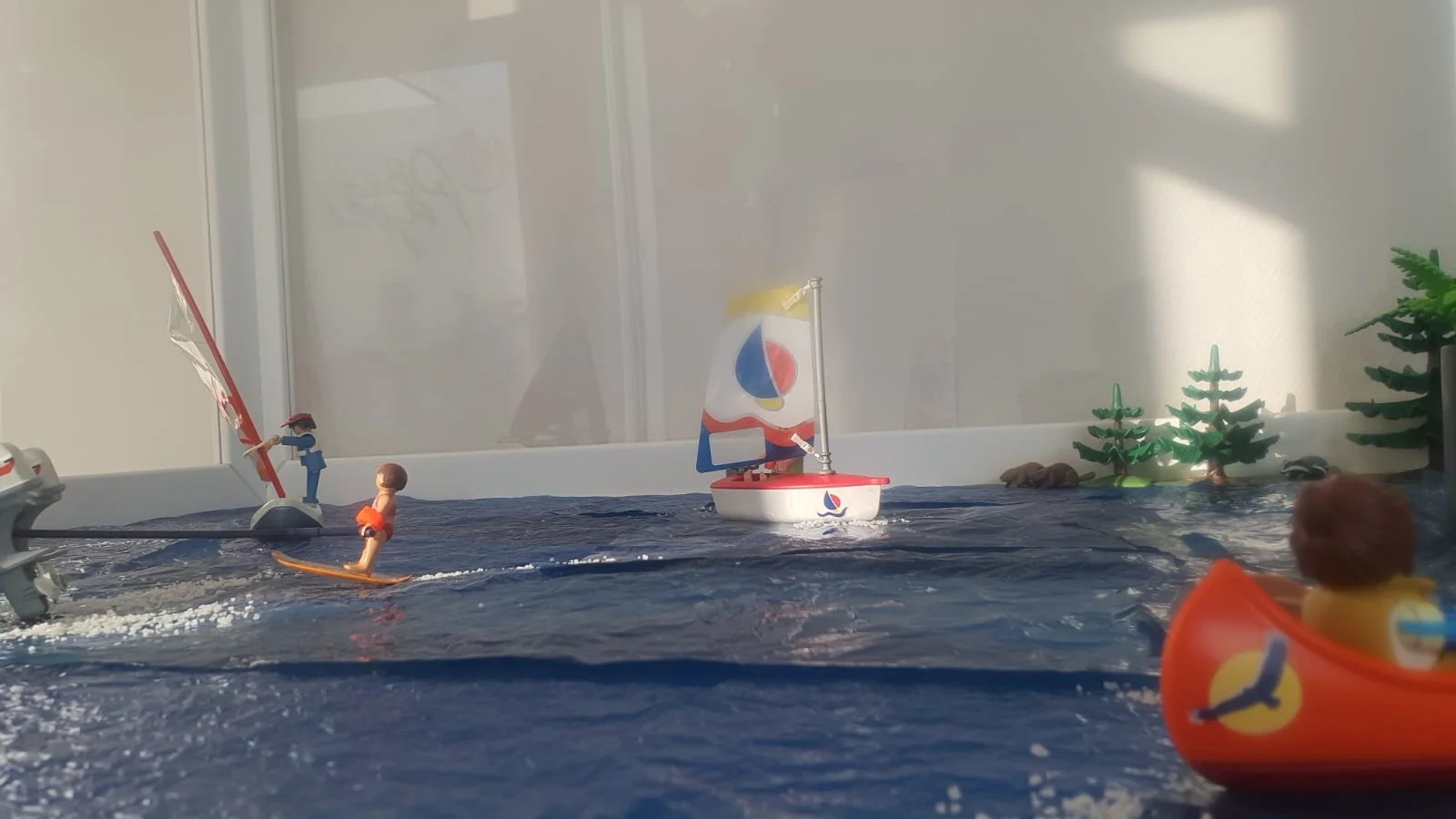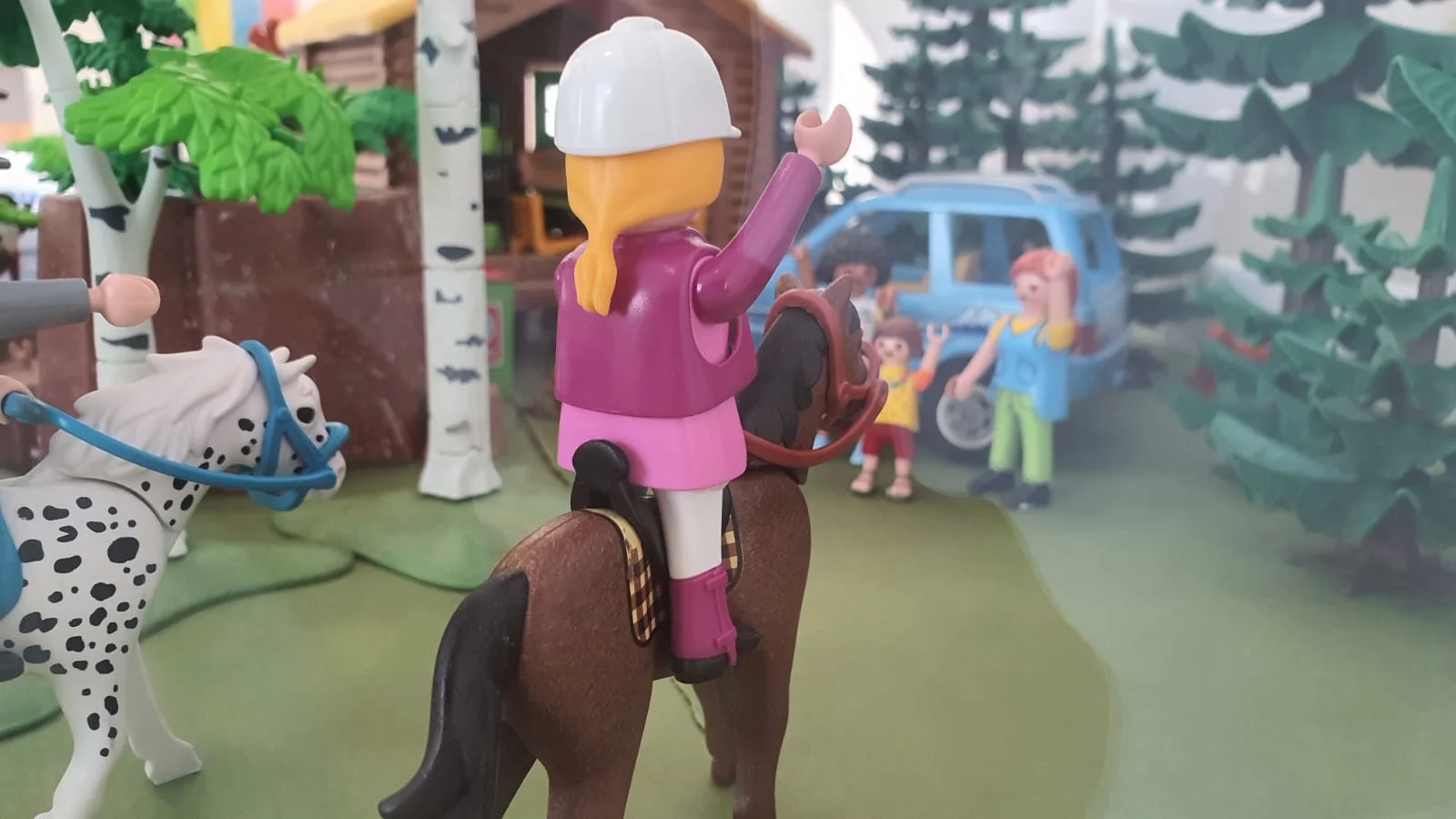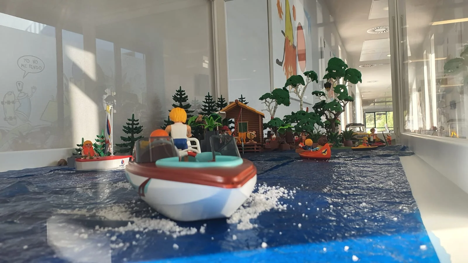 En el lago una embarcación a vela que se desliza suavemente, mientras otra a motor arrastra a un niño que practica esquí acuático. Más cerca de la orilla, kayaks y canoas disfrutan de la tranquilidad del lago. Dos jinetes pasan al trote por el sendero cercano, y una familia los saluda alegremente al verlos pasar.