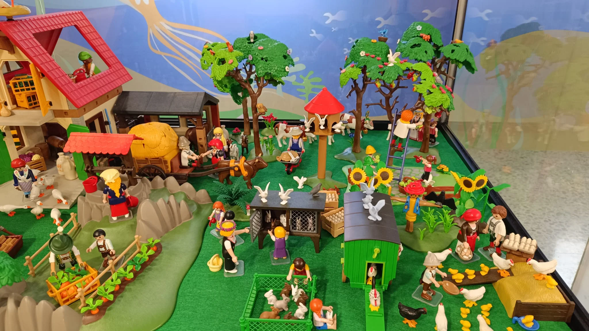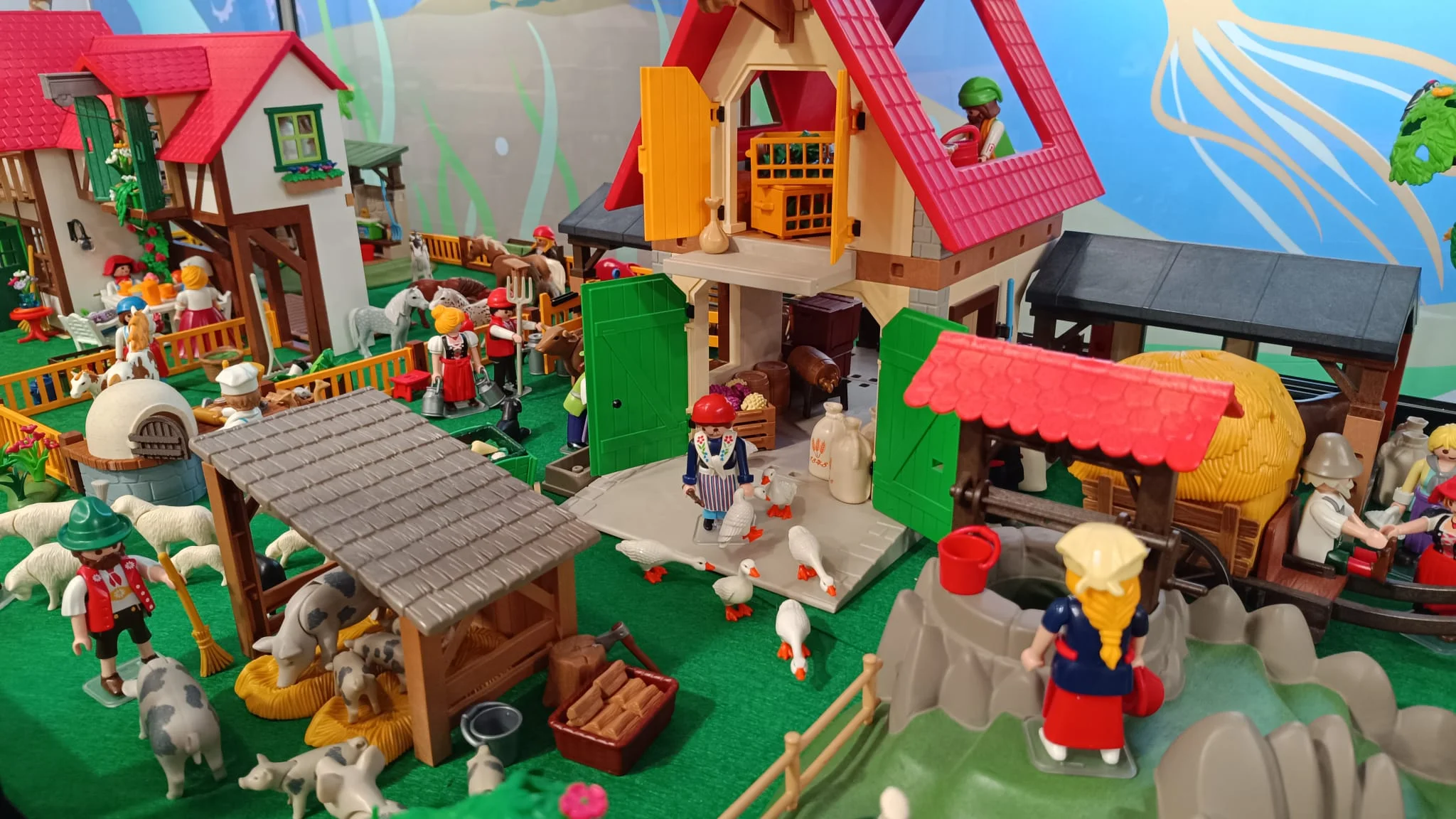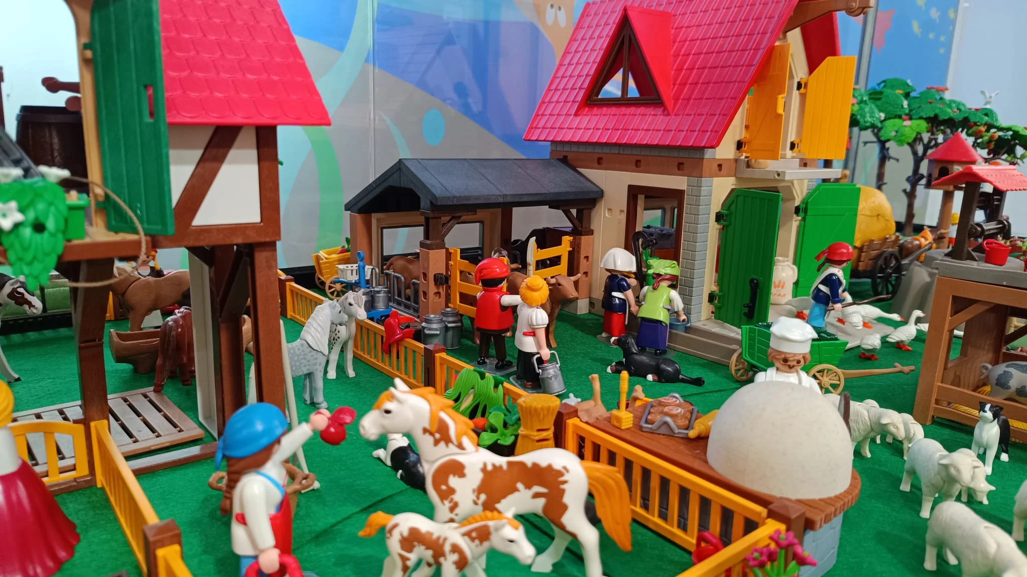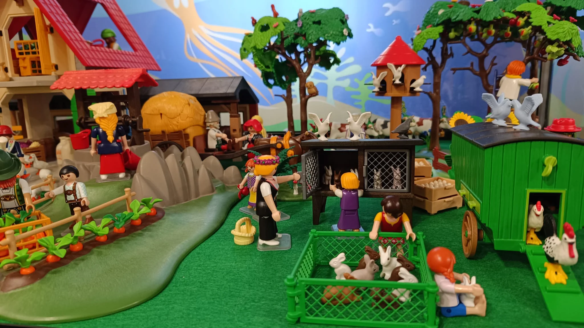 Granjas de tejado rojo, establos y cercados se distribuyen dando forma a una escena donde las figuras representan la rutina diaria del campo: granjeros alimentando a los animales, cuidando el huerto o transportando cosechas en carros y a su alrededor, gallinas, conejos, vacas y caballos.