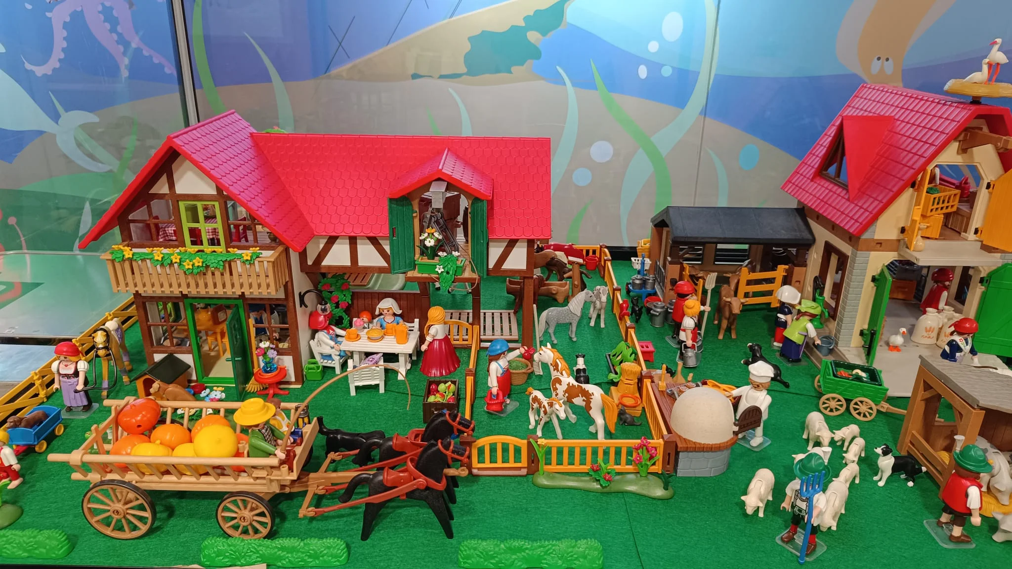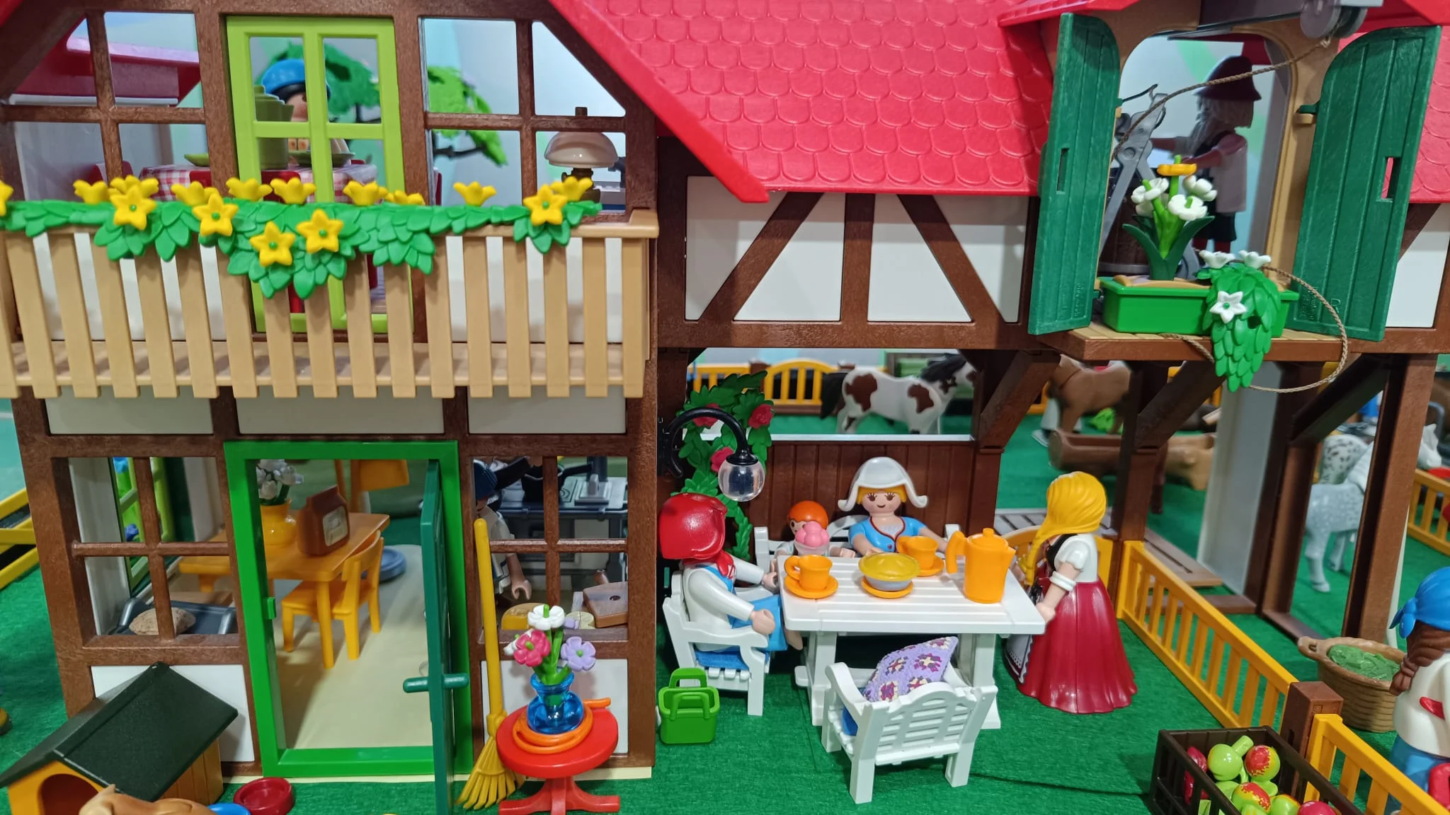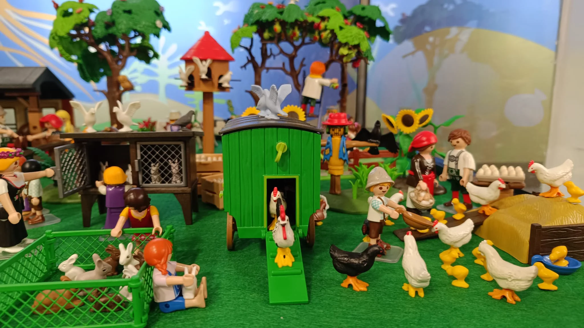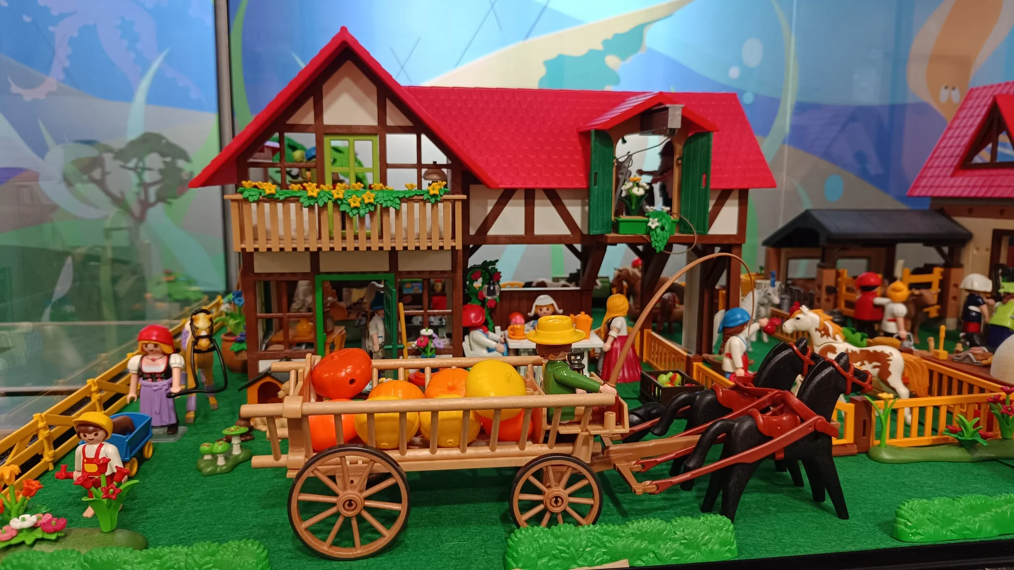 Granjas de tejado rojo, establos y cercados se distribuyen dando forma a una escena donde las figuras representan la rutina diaria del campo: granjeros alimentando a los animales, cuidando el huerto o transportando cosechas en carros y a su alrededor, gallinas, conejos, vacas y caballos.