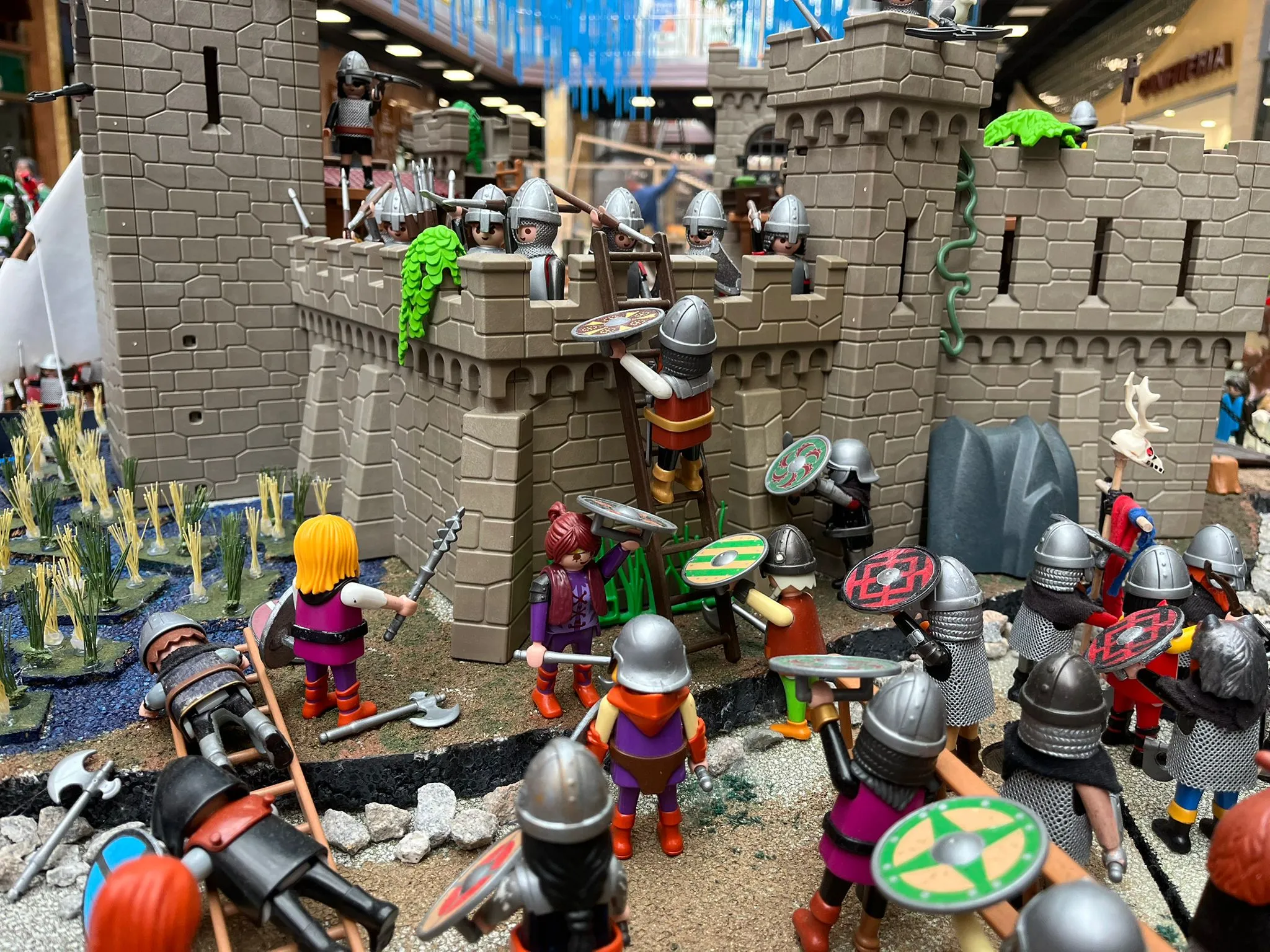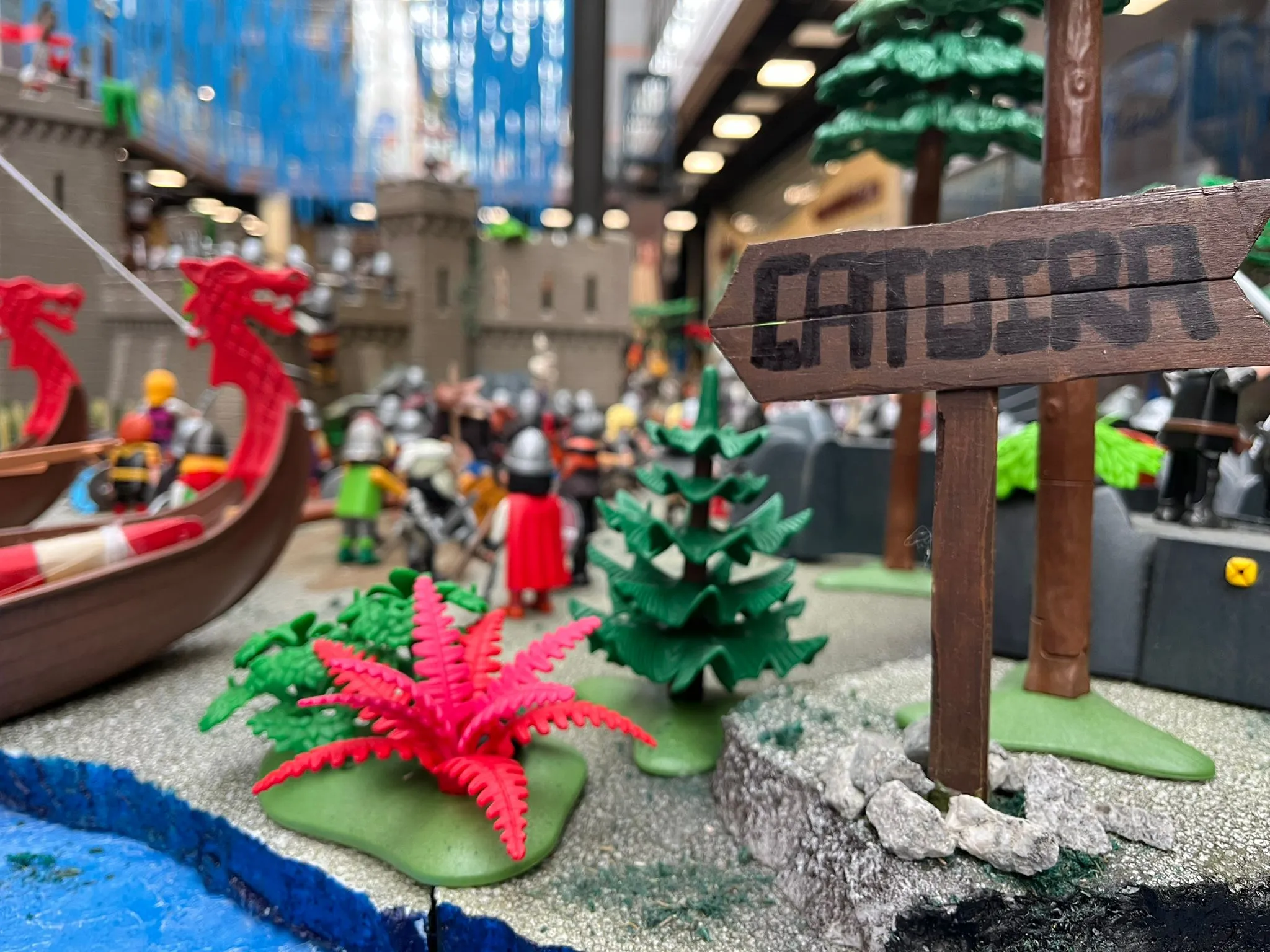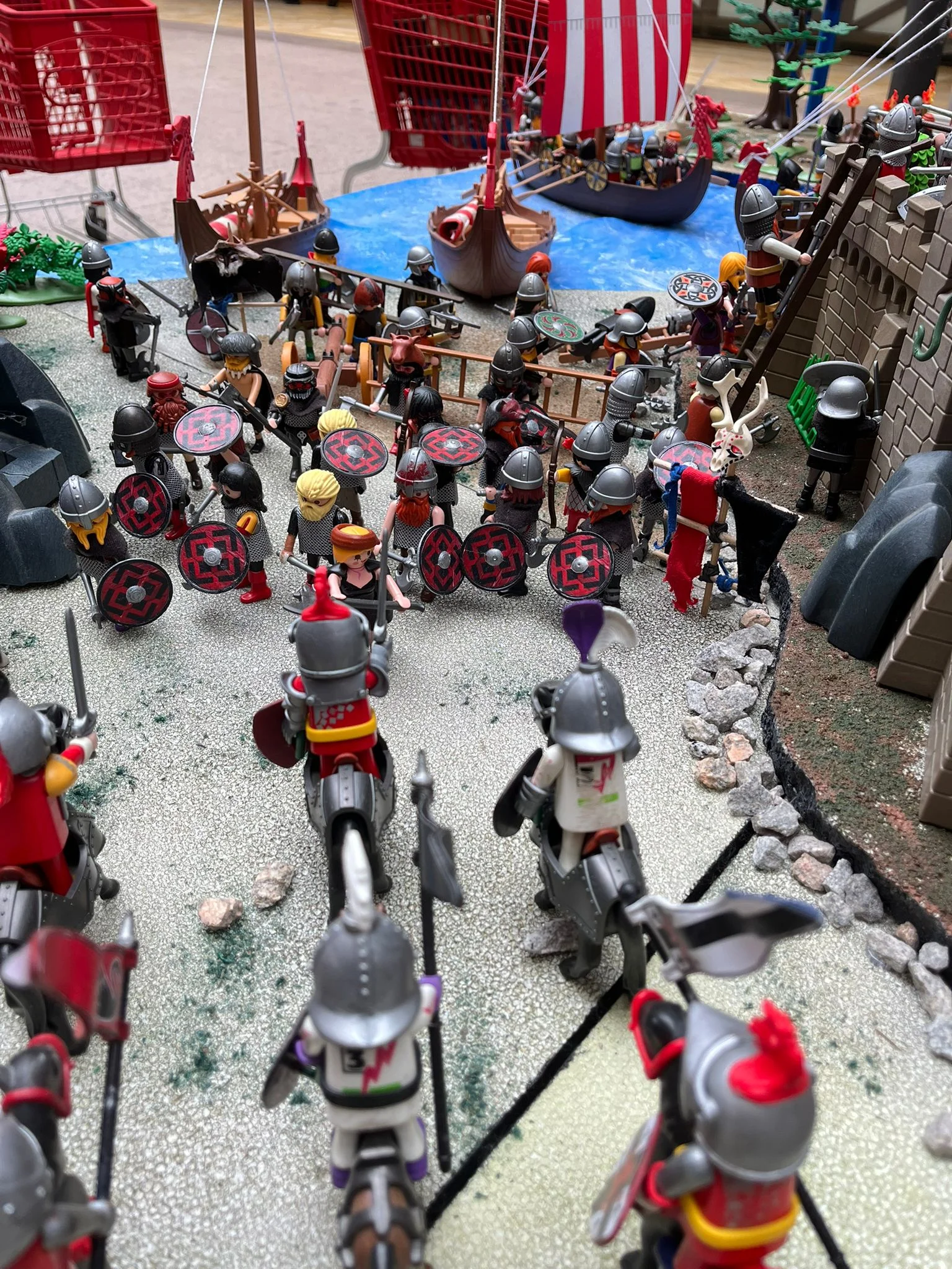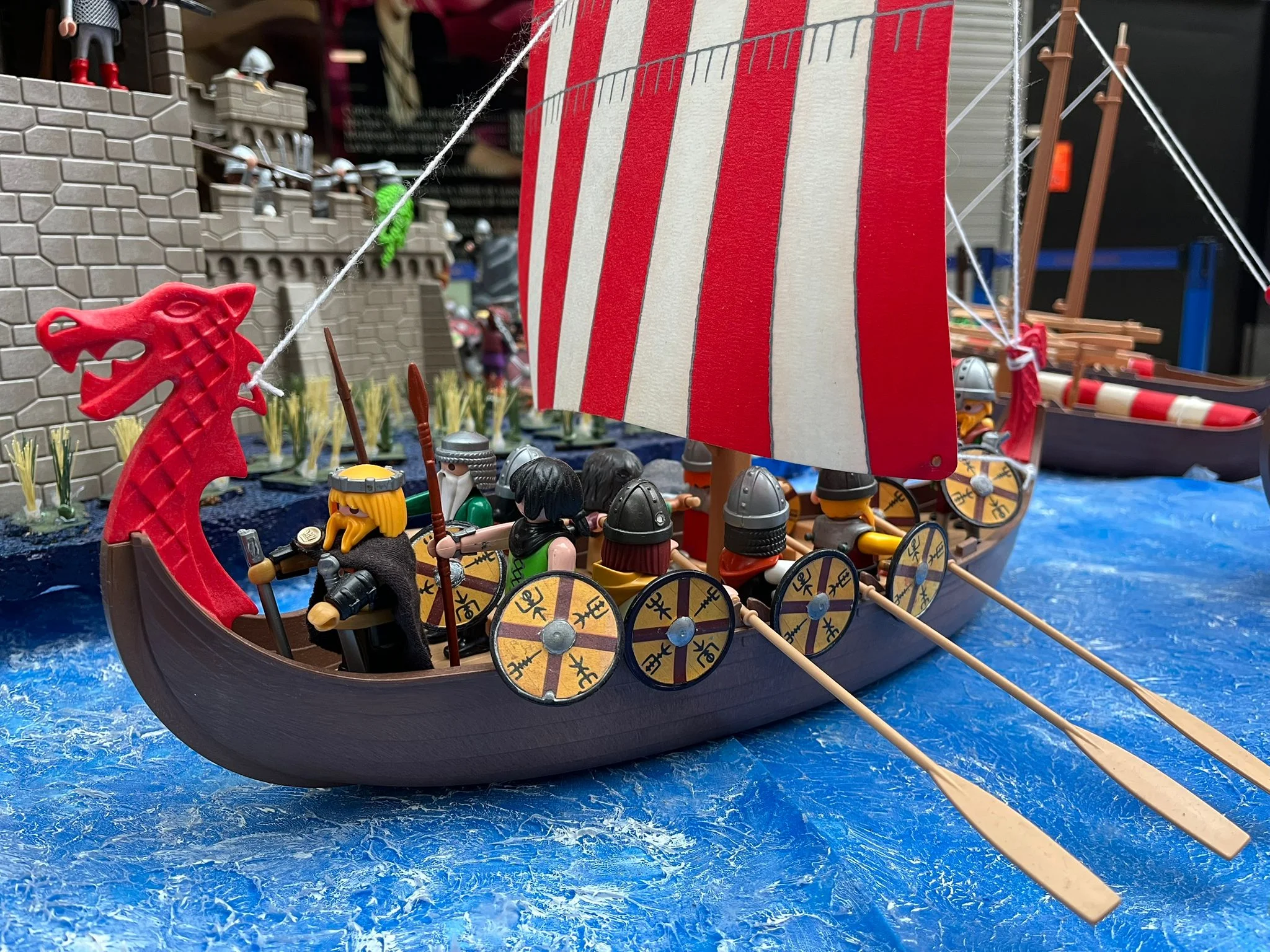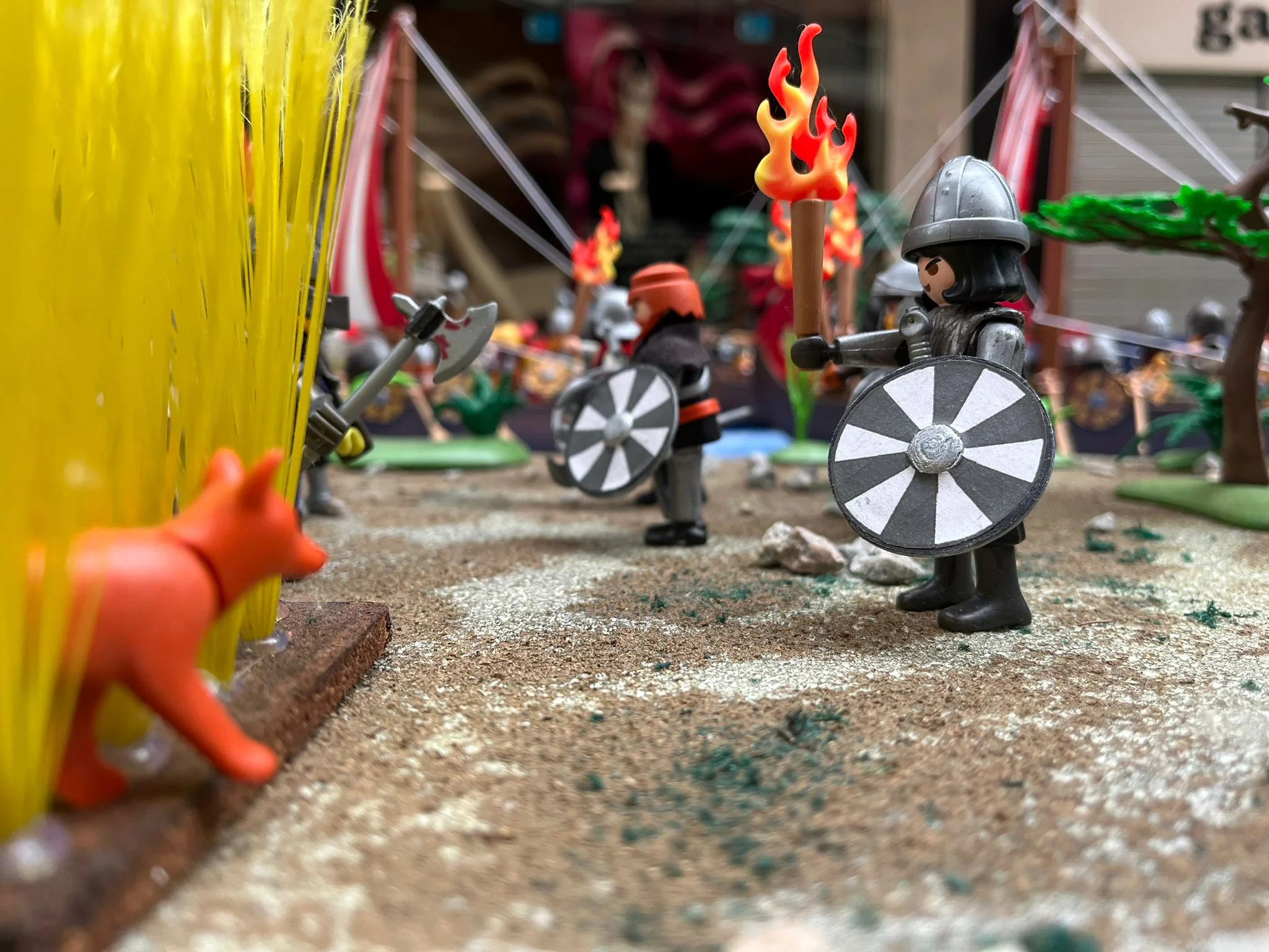 Este diorama de Playmobil representa el ataque vikingo a Catoira, un momento clave en la historia de Galicia. Los vikingos, con sus temibles drakkars, llegan por mar para intentar asaltar el castillo. Las figuras de los habitantes de Catoira están listos para defenderse, mientras se enfrentan en una batalla a gran escala, con los vikingos intentando superar las murallas y los defensores luchando por proteger su tierra.