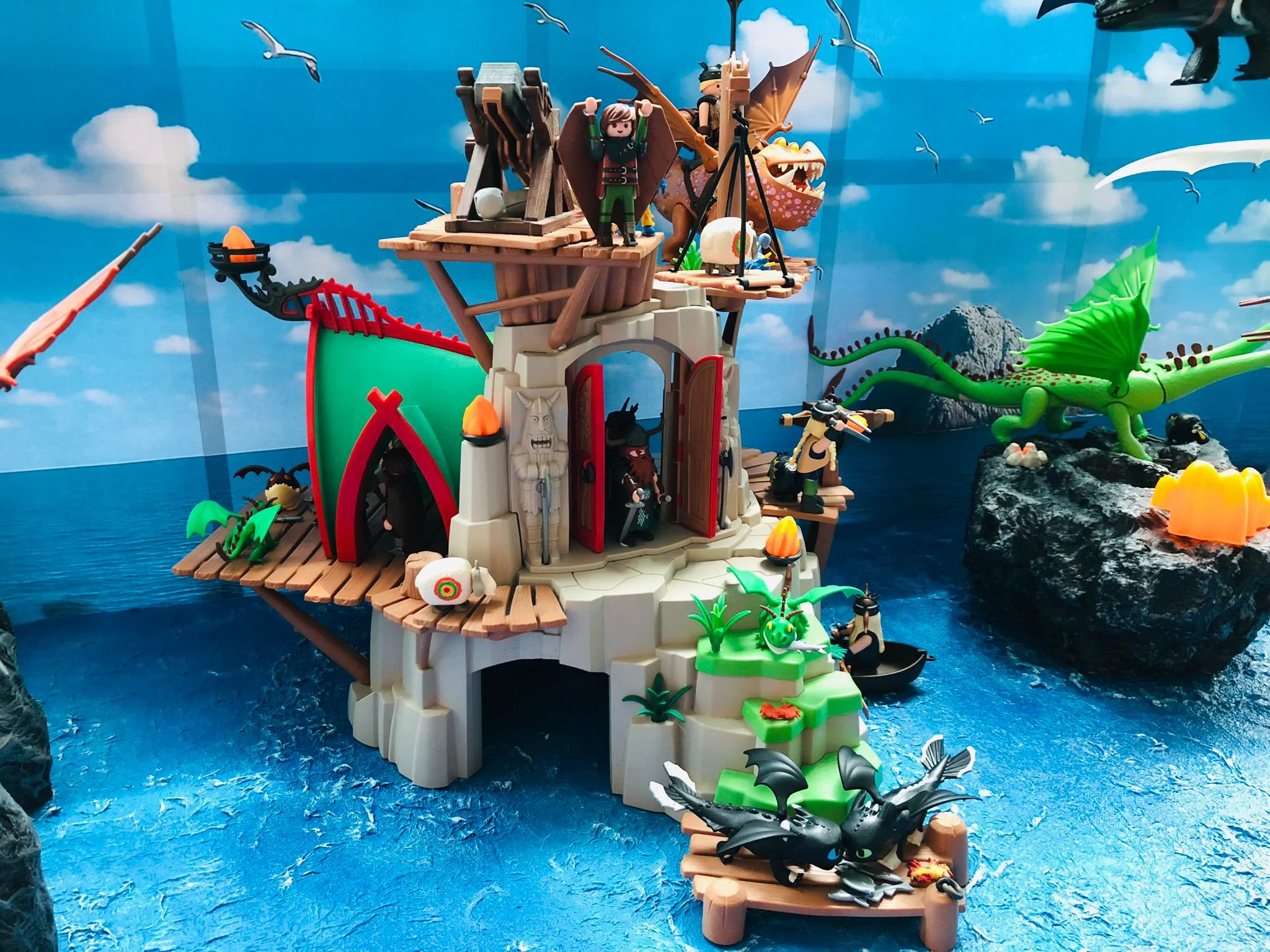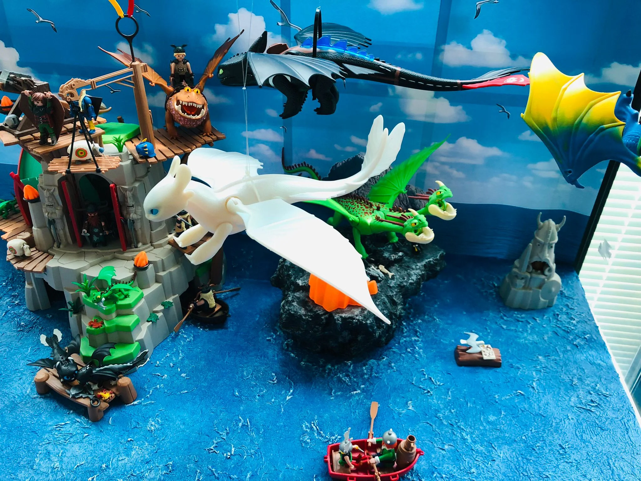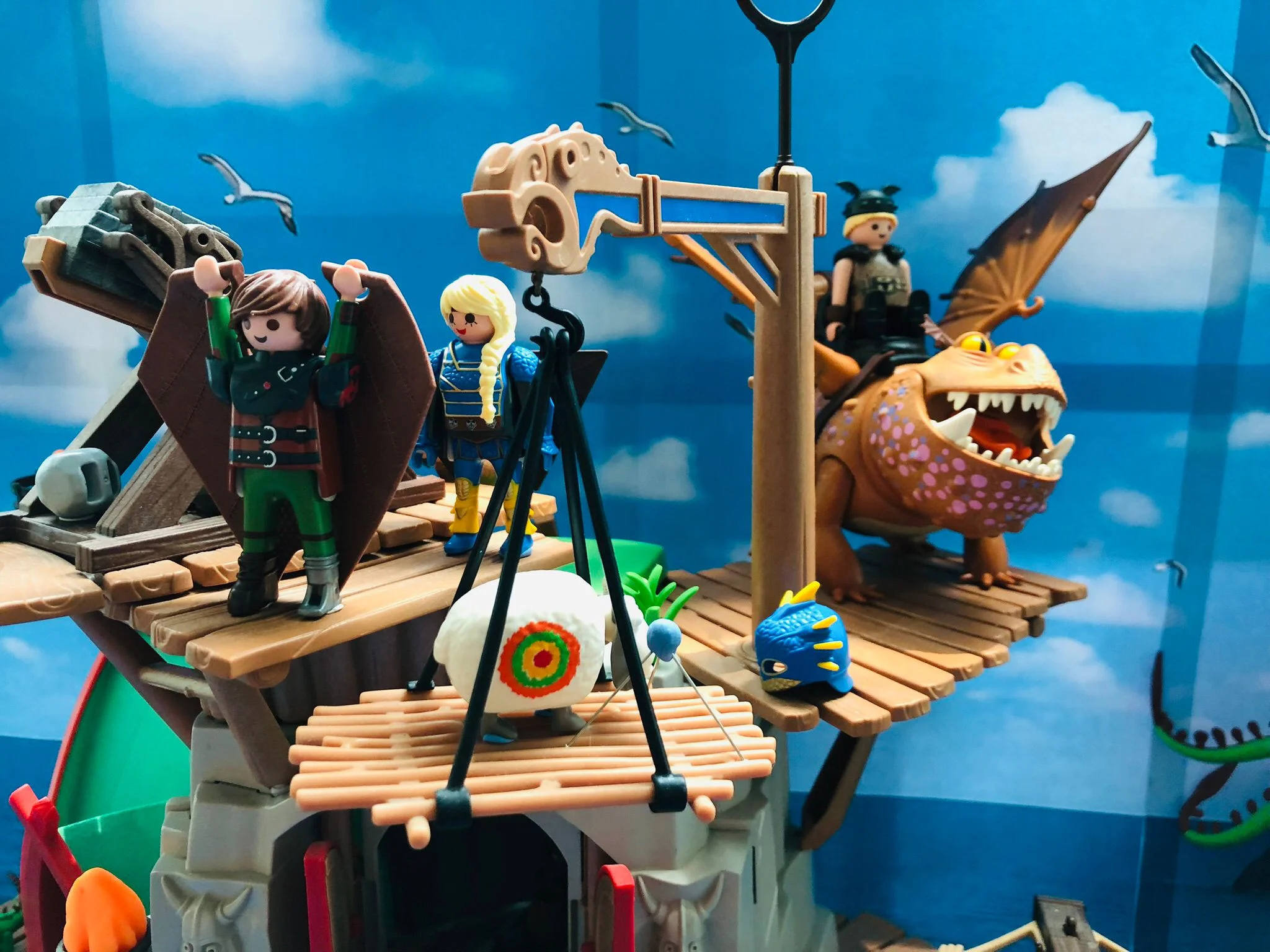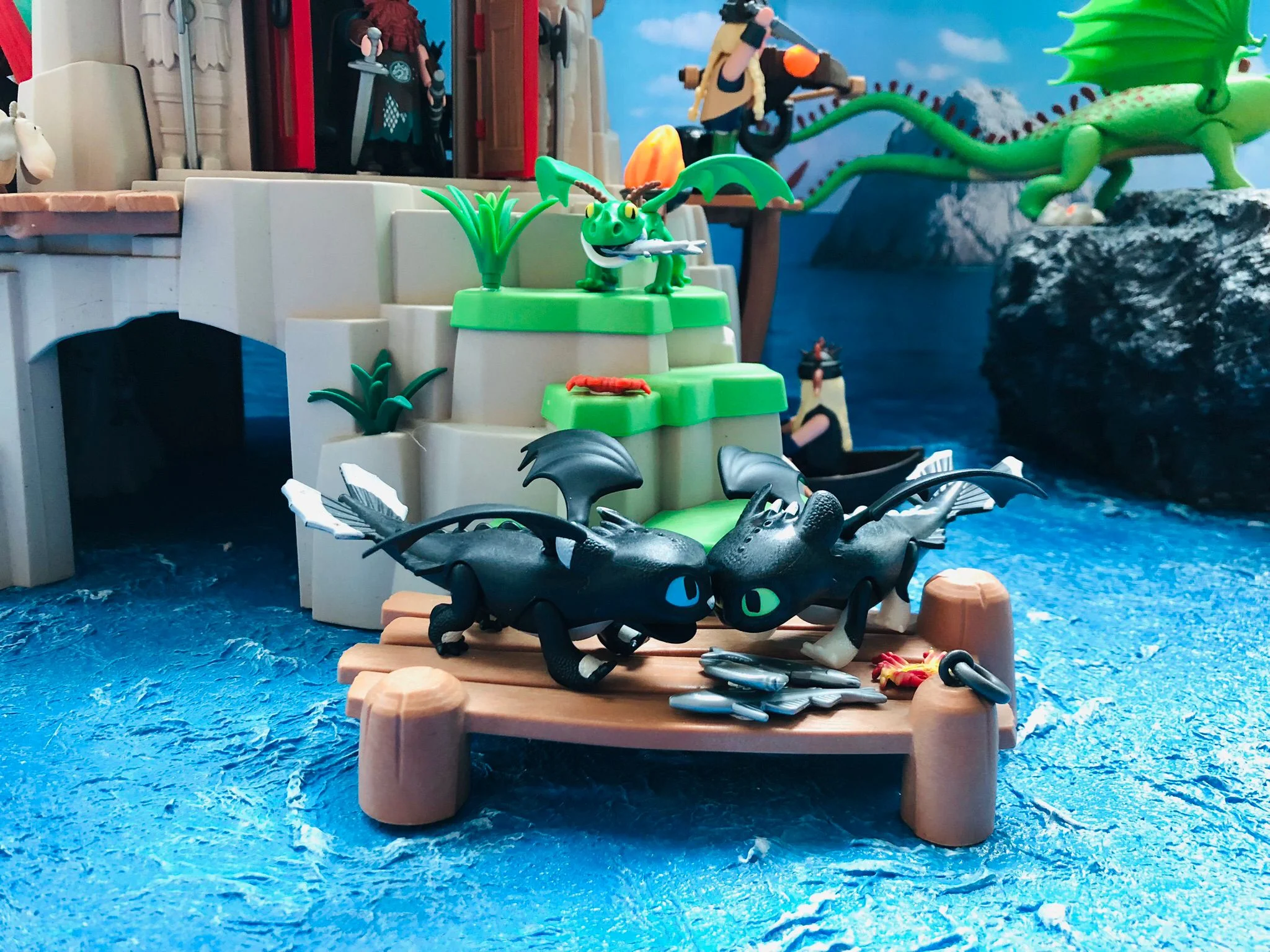 En este diorama de Playmobil, los dragones de Mema se pasean como en casa. Desdentao, el veloz Furia Nocturna, sobrevuela la escena mientras Tormenta, la Nadder mortal de Astrid, lo acompaña con su estilo inconfundible. Desde un risco, Garfios observa atento, mientras Barrilete se toma un descanso. Las crías de Desdentao, como no podía ser de otra forma, se pelean por la comida, dejando una estampa de lo más divertida.