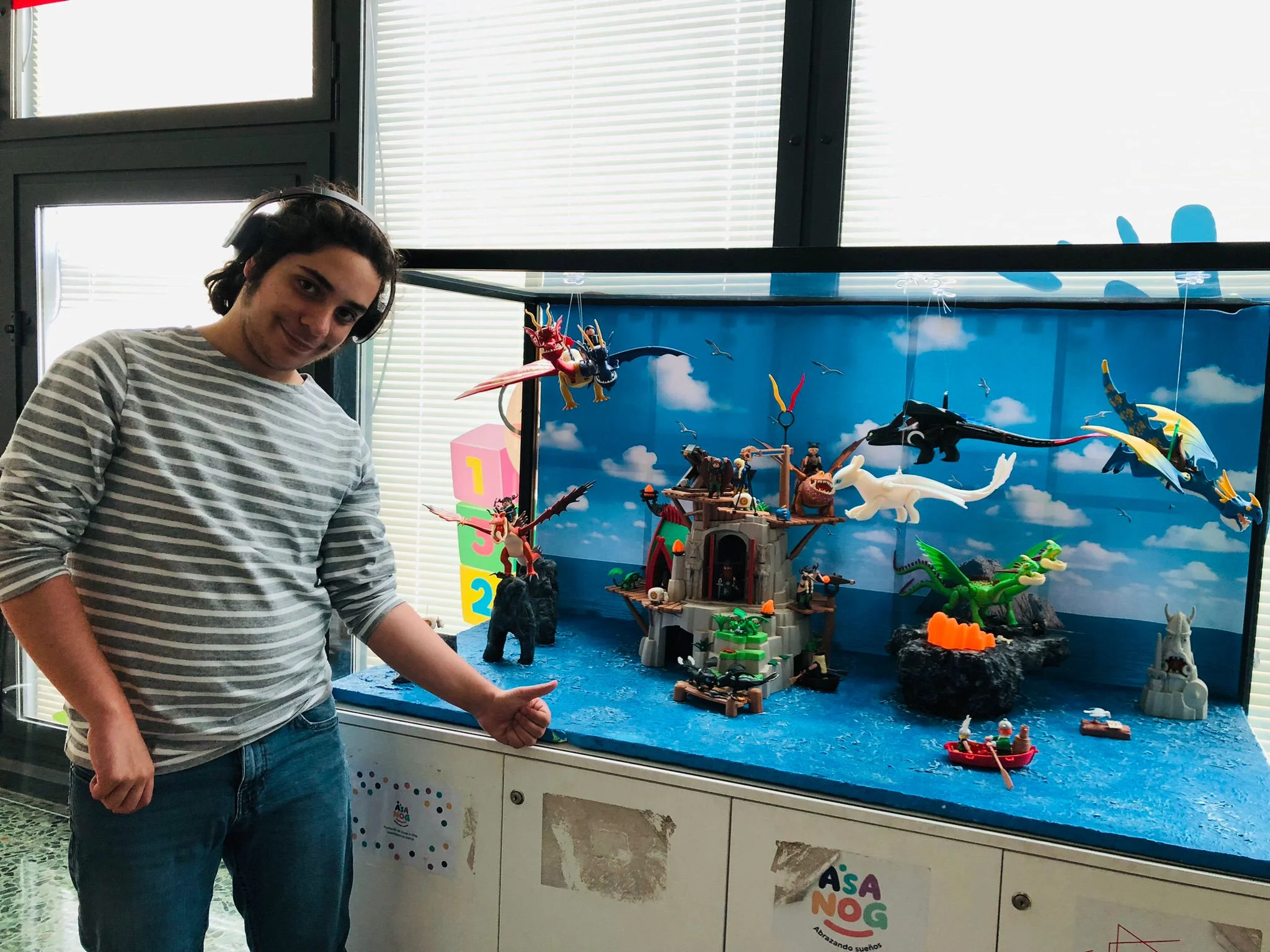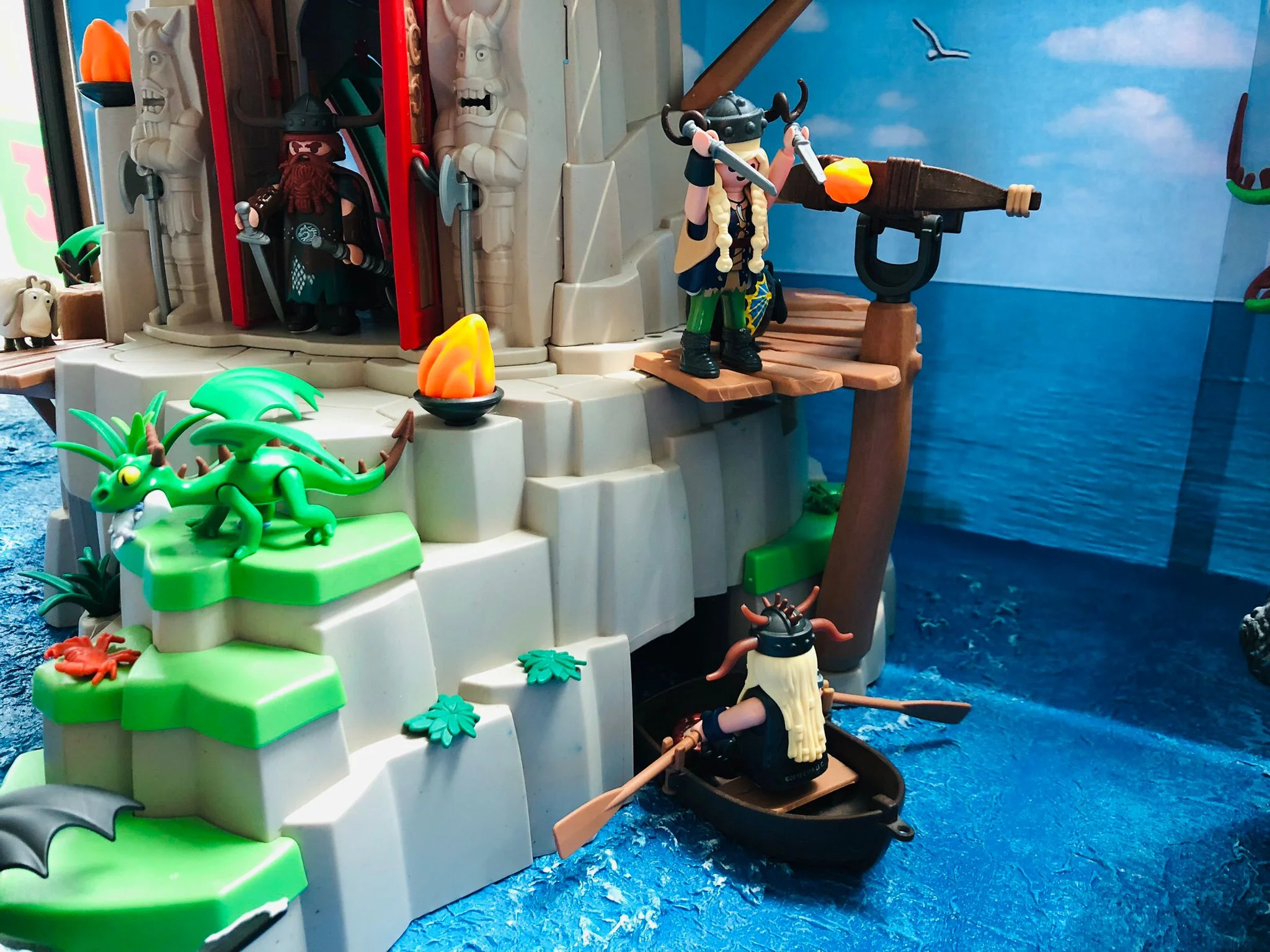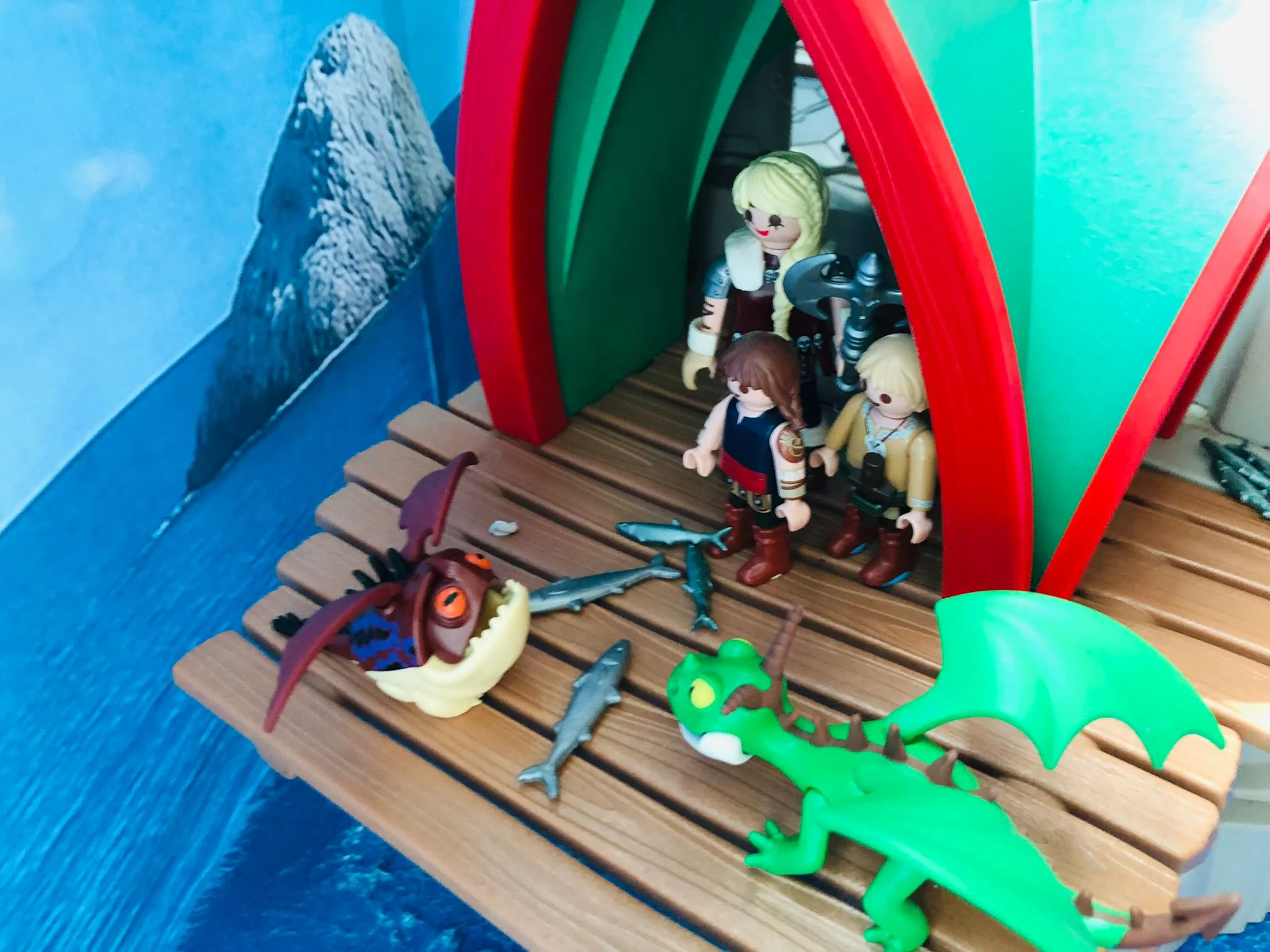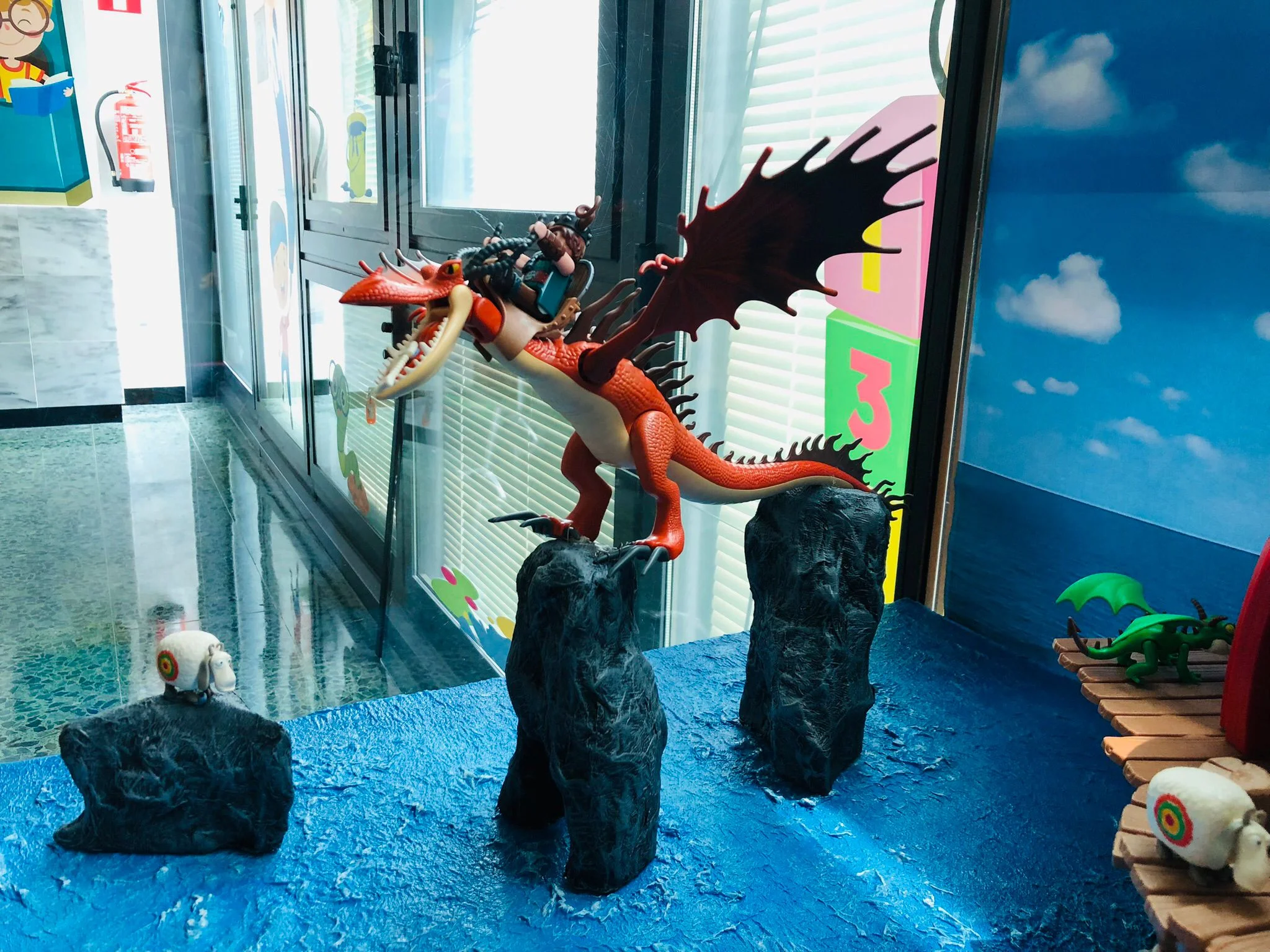 En este diorama de Playmobil, los dragones de Mema se pasean como en casa. Desdentao, el veloz Furia Nocturna, sobrevuela la escena mientras Tormenta, la Nadder mortal de Astrid, lo acompaña con su estilo inconfundible. Desde un risco, Garfios observa atento, mientras Barrilete se toma un descanso. Las crías de Desdentao, como no podía ser de otra forma, se pelean por la comida, dejando una estampa de lo más divertida.