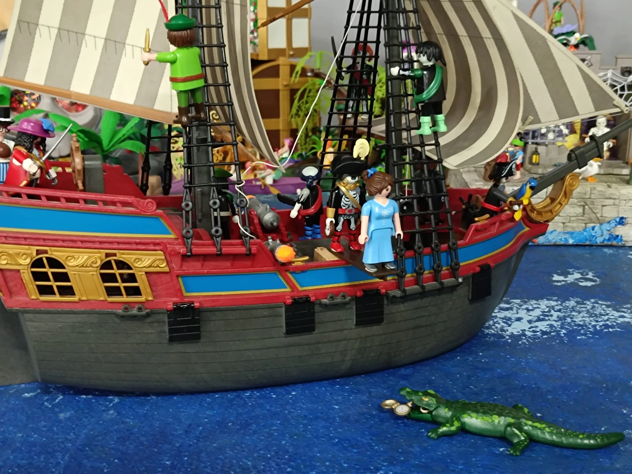 Al primero que vieron desde el aire fue al temible capitán Garfio, el peor enemigo de Peter Pan. Aunque había algo a lo que el capitán Garfio tenía miedo: el cocodrilo. Una vez estuvo a punto de comérselo y por eso ahora no quería otra cosa que no fuese él. Menos mal que el capitán le arrojó un reloj y por eso ahora hacía tic-tac cada vez que se acercaba.