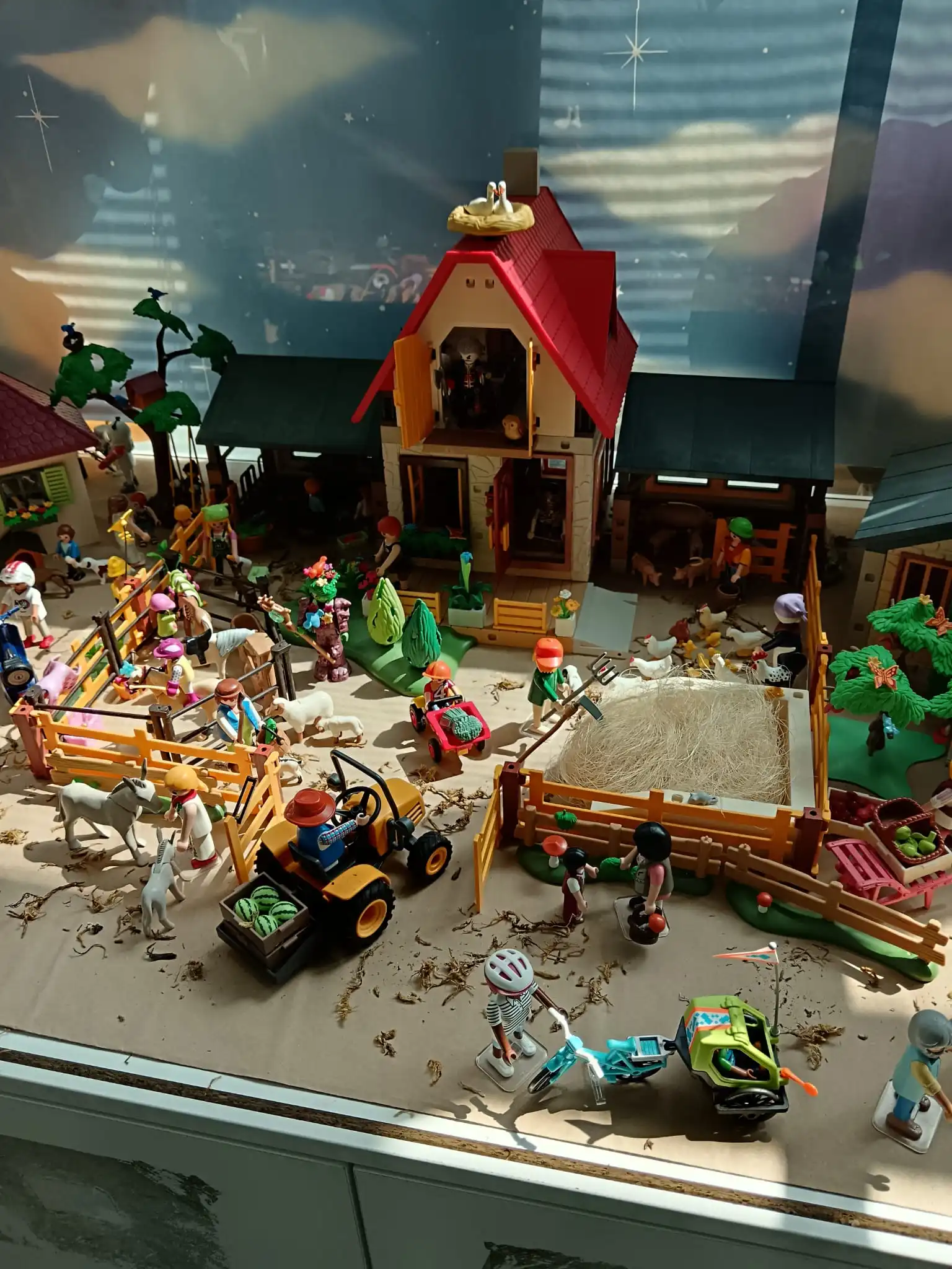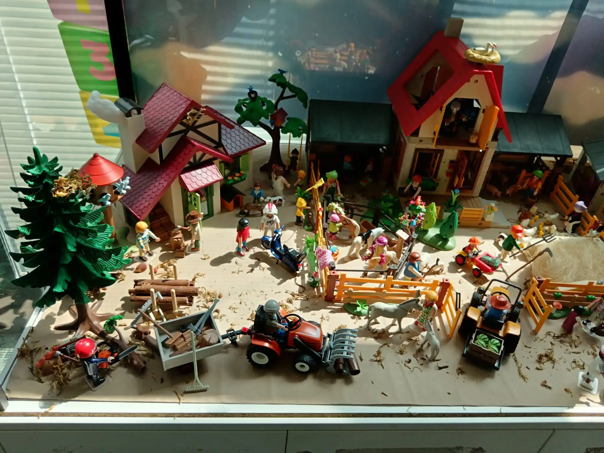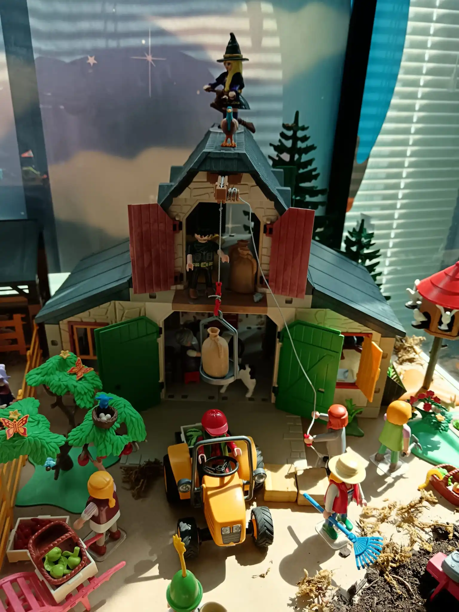 En este diorama de Playmobil, nos trasladamos a una encantadora granja donde la vida cotidiana transcurre con tranquilidad y armonía. Los granjeros cuidan de los animales, recogen los productos del campo y realizan pequeñas labores agrícolas, reflejando la esencia del trabajo rural. En cada rincón se puede ver la dedicación y el esfuerzo, desde el ordeño de las vacas hasta la alimentación de los caballos, pasando por la recolección de frutas y verduras frescas.